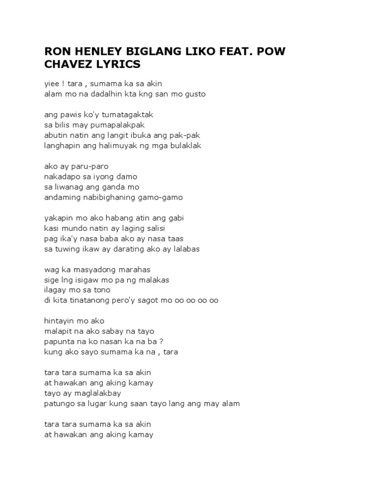 Tayo lang Sige lang sumayaw sa hinihingi ng pagkakataon Umindak sa kumpas ng kabog ng dibdib na hindi mahinahon Di niya mapapansin Di ka man tumingin Dinig ko ang bawat patak ng luha mo Pero tayo lang ang nakakaalam Nandon sa pagitan ng paalam at pahiram Tayo lang ang may alam. Abot-kamay abot-tanaw pero di makagalaw. Ron Henley - Biglang Liko lyrics.