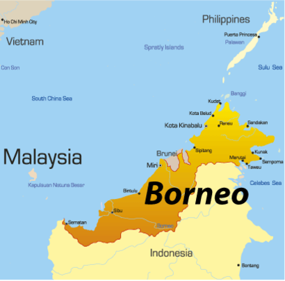 Batay sa mga pag-aaral ang gubat ng Borneo ay nabibilang sa teritoryo ng mga islang Kalimantan ng Indones.