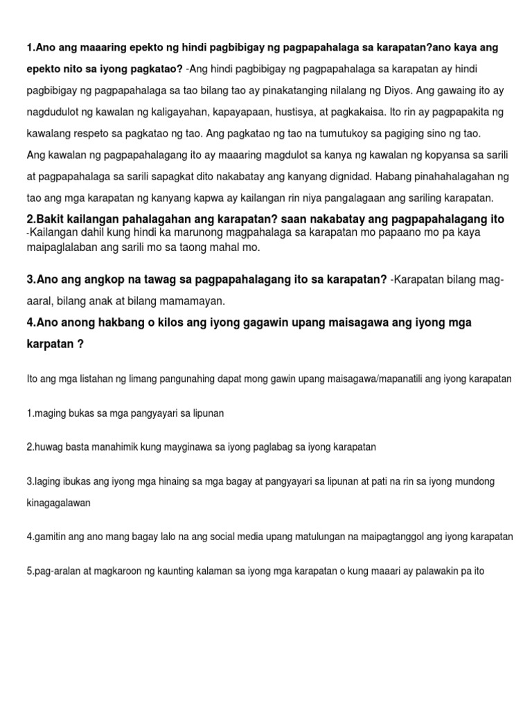 Saan nakabatay ang karapatan ipaliwanag. Karapatan ng bawat Isa na mag isip ng kanikanilang ninanais sa buhayupang ang karapatan sa buhay ng bawat tao ay kailangan ng bawat mamamayan dahil Ito ay mahalagatungkulin ng bawat Isa sa anumang mga Gawain o nais gawin kenn14. Edukasyon sa Pagpapakatao 13022021 0215 calmaaprilgrace. Tamang sagot sa tanong.